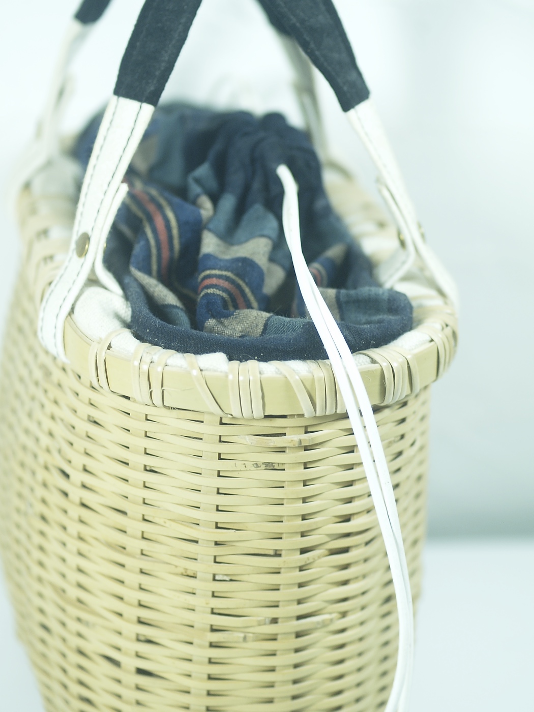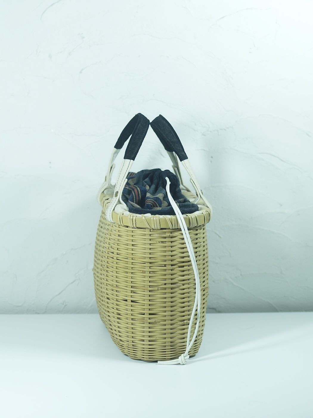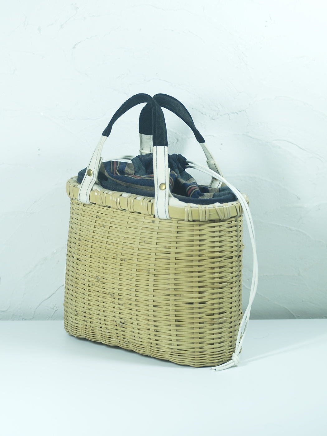 油抜きした白竹ござ目編み籐による縁巻き本体:高さ20cm横25cmまち14cm重さ500g古布の巾着及びレザーコード(白)一品物 35,000円 (送料別) 在庫あり
