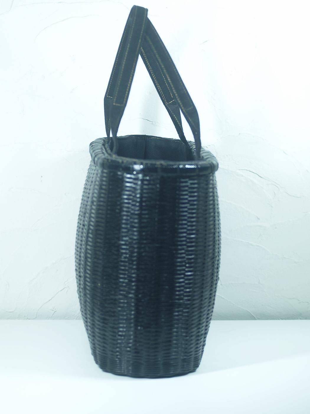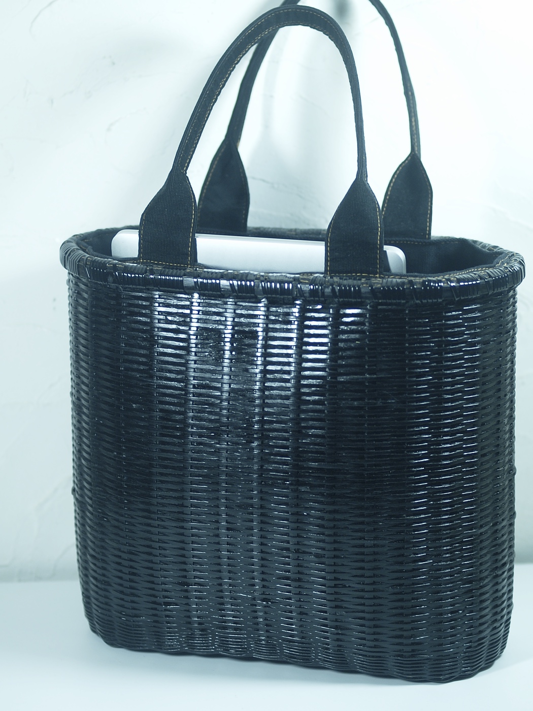 青竹ござ目編み樹脂コードによる縁巻き本体:高さ30cm横34cmまち18cm重さ1000g内布:帆布11号黒/縫い付け持ち手:スエード調布/黒/幅4cmカスタマイズ可 80,000円 (送料別) 受注生産